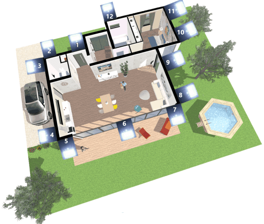 Na poniższym planie możesz zobaczyć, gdzie i ile reflektorów należy zainstalować, biorąc pod uwagę średniej wielkości powierzchnię: